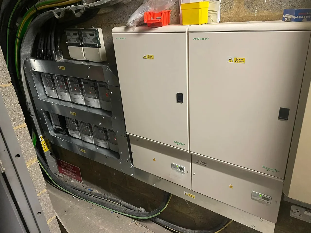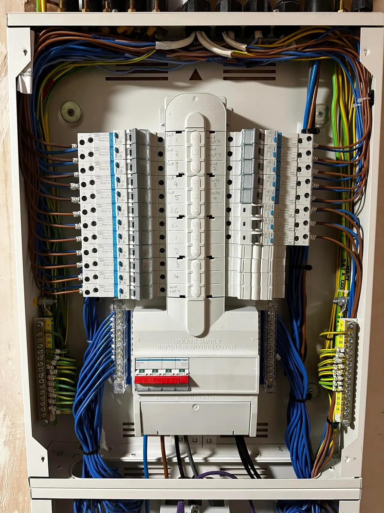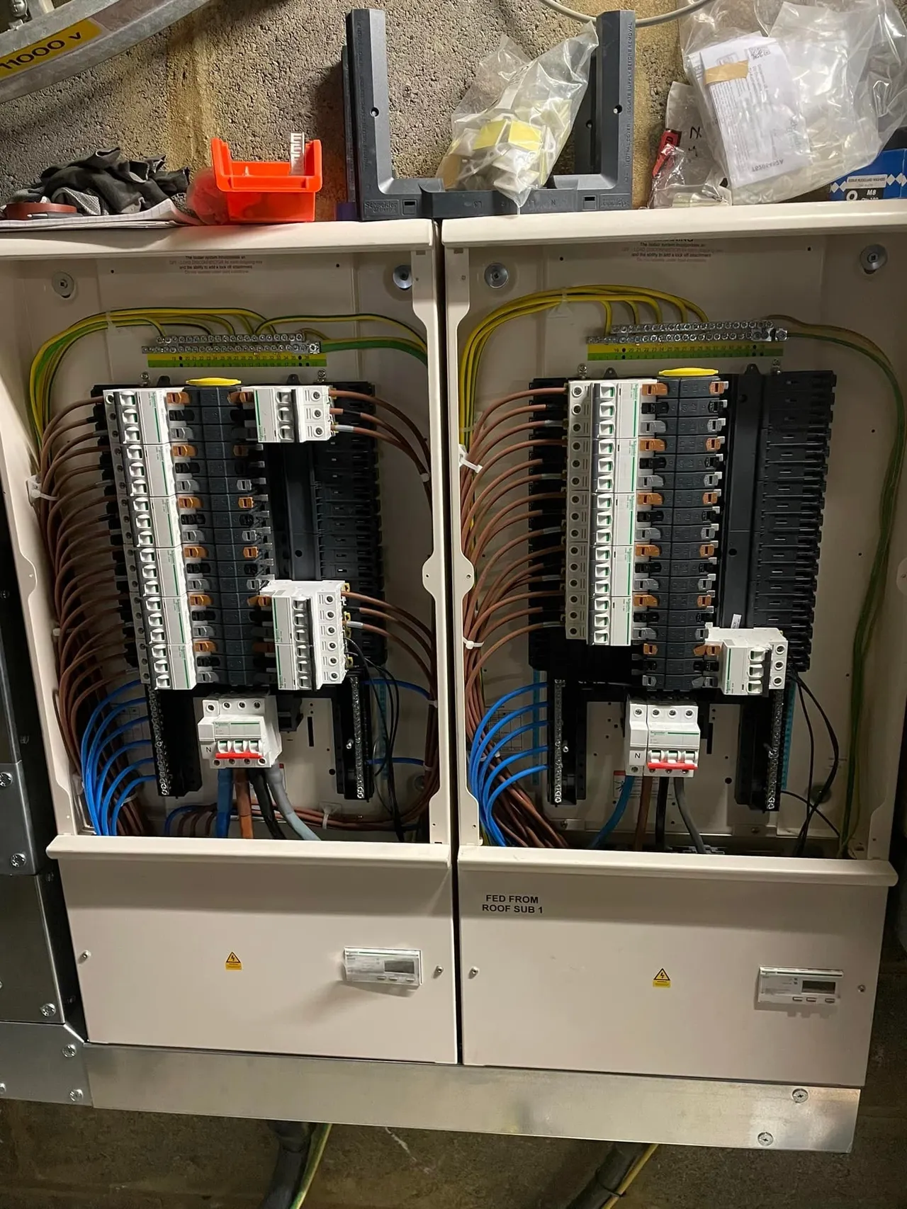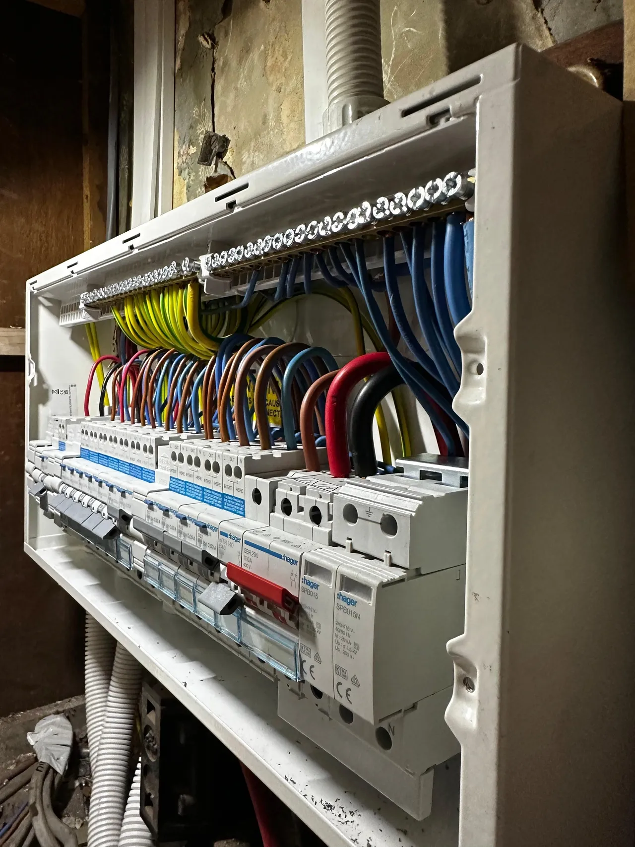 Replacement of outdated consumer units with modern circuit breakers and RCDs, enhancing safety against electrical faults and increasing capacity for additional circuits.